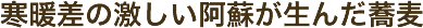 蕎麦は一般に「寒暖差があり霧が発生し湿度の低い地域のものがおいしい」と言われています。阿蘇は日中は30度を越す夏の日でも、夜には10度前後まで気温が下がり、朝もやの発生も多く1年を通して湿度のバランスがよいという気象条件にあり、そばづくりに適した地域と言えます。